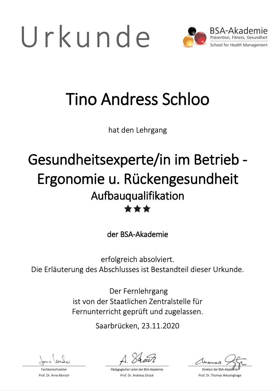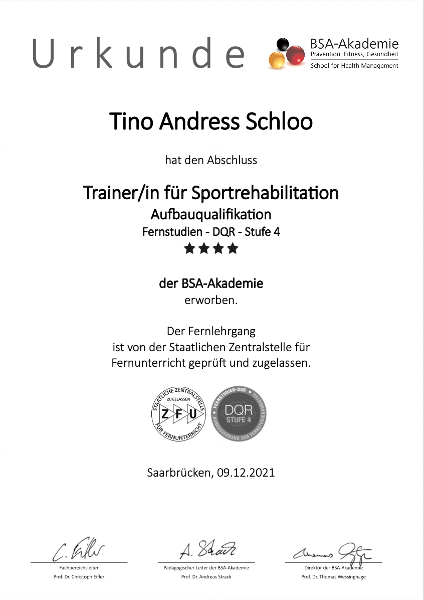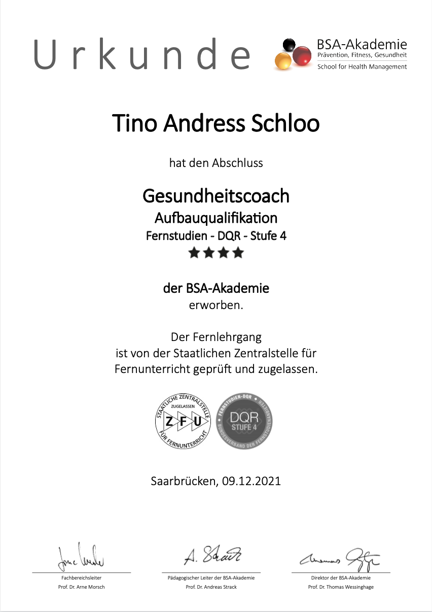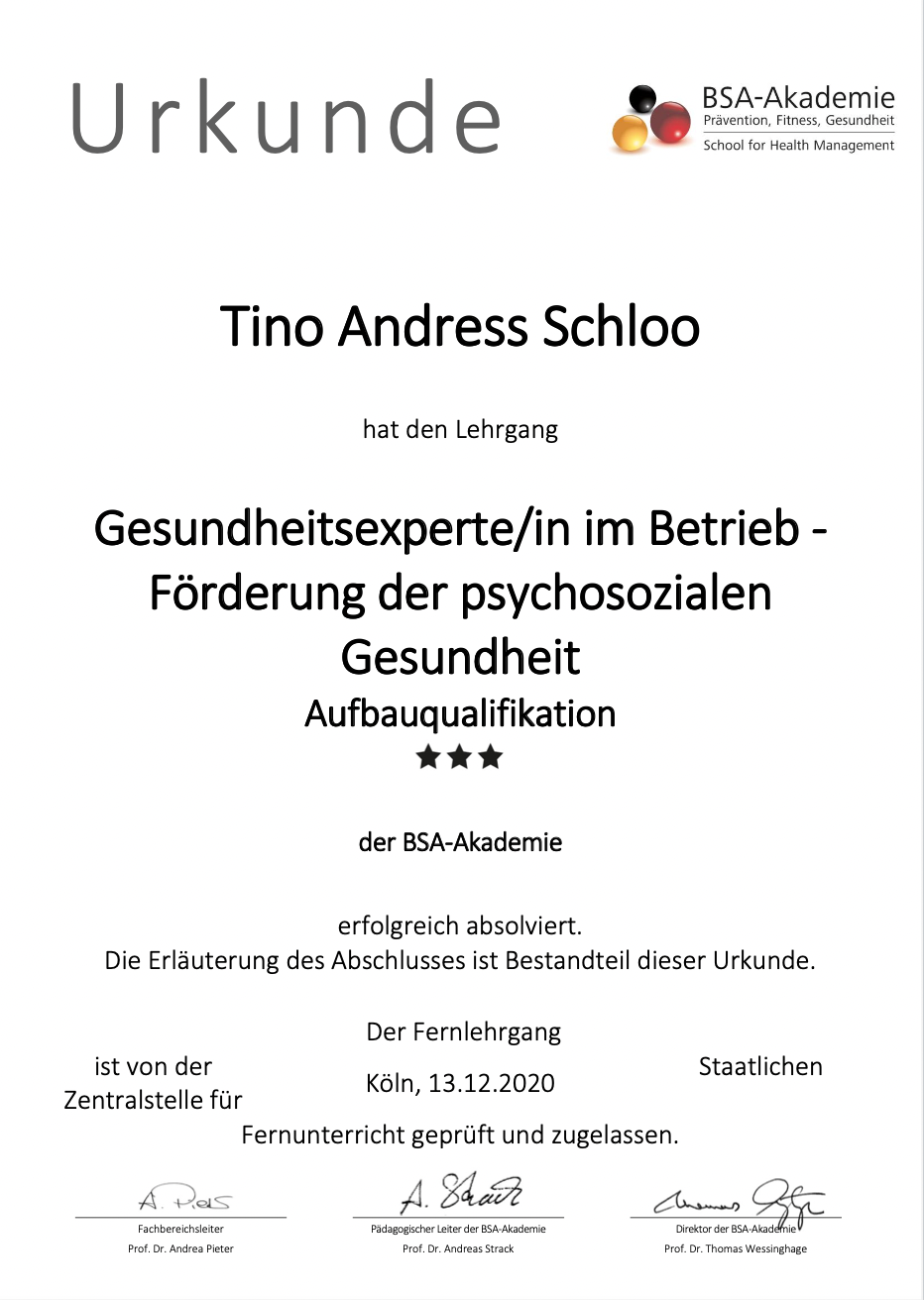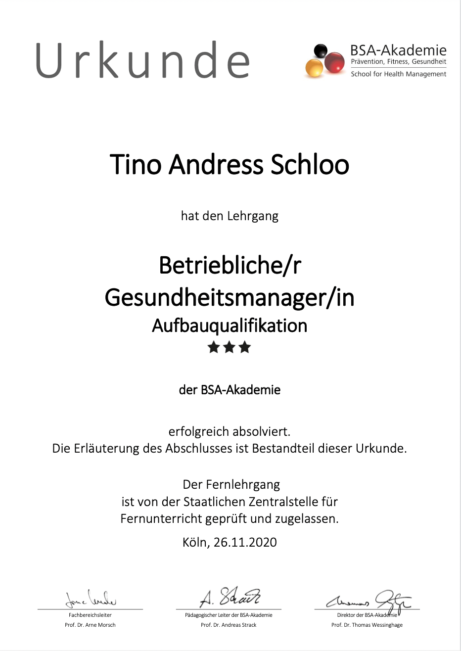 Um noch mehr Menschen zu erreichen, spezialisierte er sich auf Gesundheitskonzepte und Maßnahmen für Unternehmen, die möglichst viele Mitarbeiter motivieren einen gesünderen Lebensstil zu führen und mehr Leistung abrufen zu können. Hierfür erweitere er sein Wissen in zahlreichen Fortbildungen und ist Fachkraft für betriebliches Gesundheitsmanagement (IHK), Betrieblicher Gesundheitsmanager (BSA) sowie Gesundheitsexperte im Betrieb für Ergonomie und Rückengesundheit (BSA).